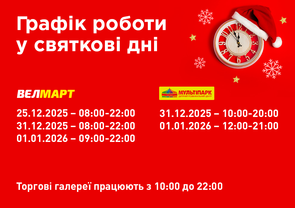 Друзі, ТРЦ «Екватор» в Чернівцях у святкові дні працюватиме за звичним графіком☺️✨ Торгові галереї — з 10:00 до 22:00* (*Графік роботи магазинів уточнюйте безпосередньо у магазині, що цікавить) Зміни у режимі роботи розважальних закладів та гіпермаркетів «Велмарт» тут👇