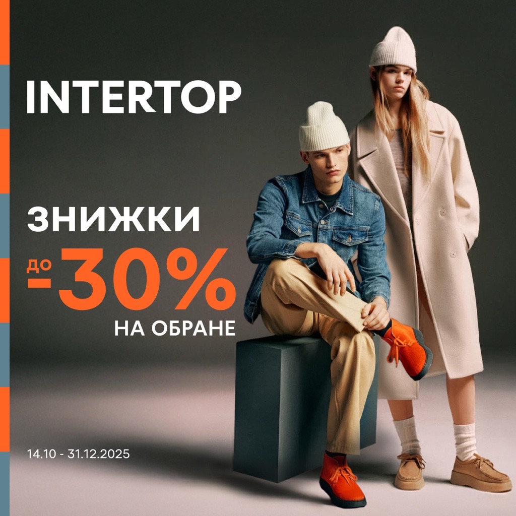 ДОКЛАДНІШЕМіжсезонний розпродаж в INTERTOP Знижки до -30% на обрані бренди діють у магазинах, на сайті та в застосунку INTERTOP. ECCO, Armani Exchange, Vans, Geox, Timberland, Marc O’Polo і ще багато інших брендів за вигідними цінами В магазинах знижка діє з 14 жовтня до 31 грудня 2025 року.