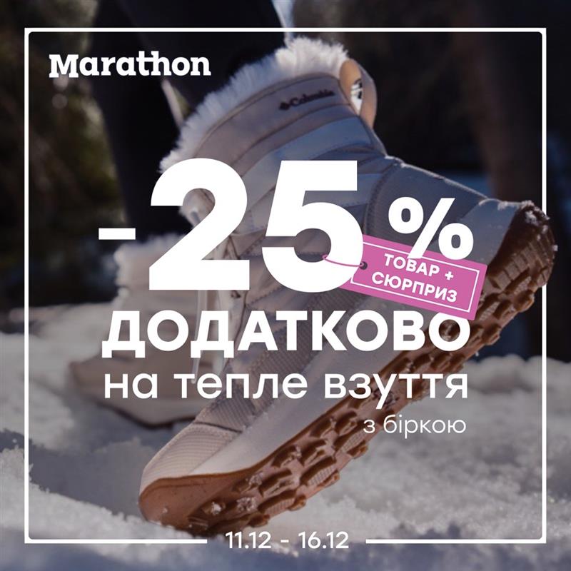 Marathon дарує -25% додатково на тепле взуття з біркою ❄️🔥 Акція буде діяти з 11.12 та по 16.12.2025 Купуй тепле взуття за вигідними цінами та зустрічай холод впевнено разом з Marathon 💪 Товари зі знижкою знайдеш у магазині зі спеціальною біркою 🩷🎁 💢 Ціни на сайті вказані вже зі знижкою.