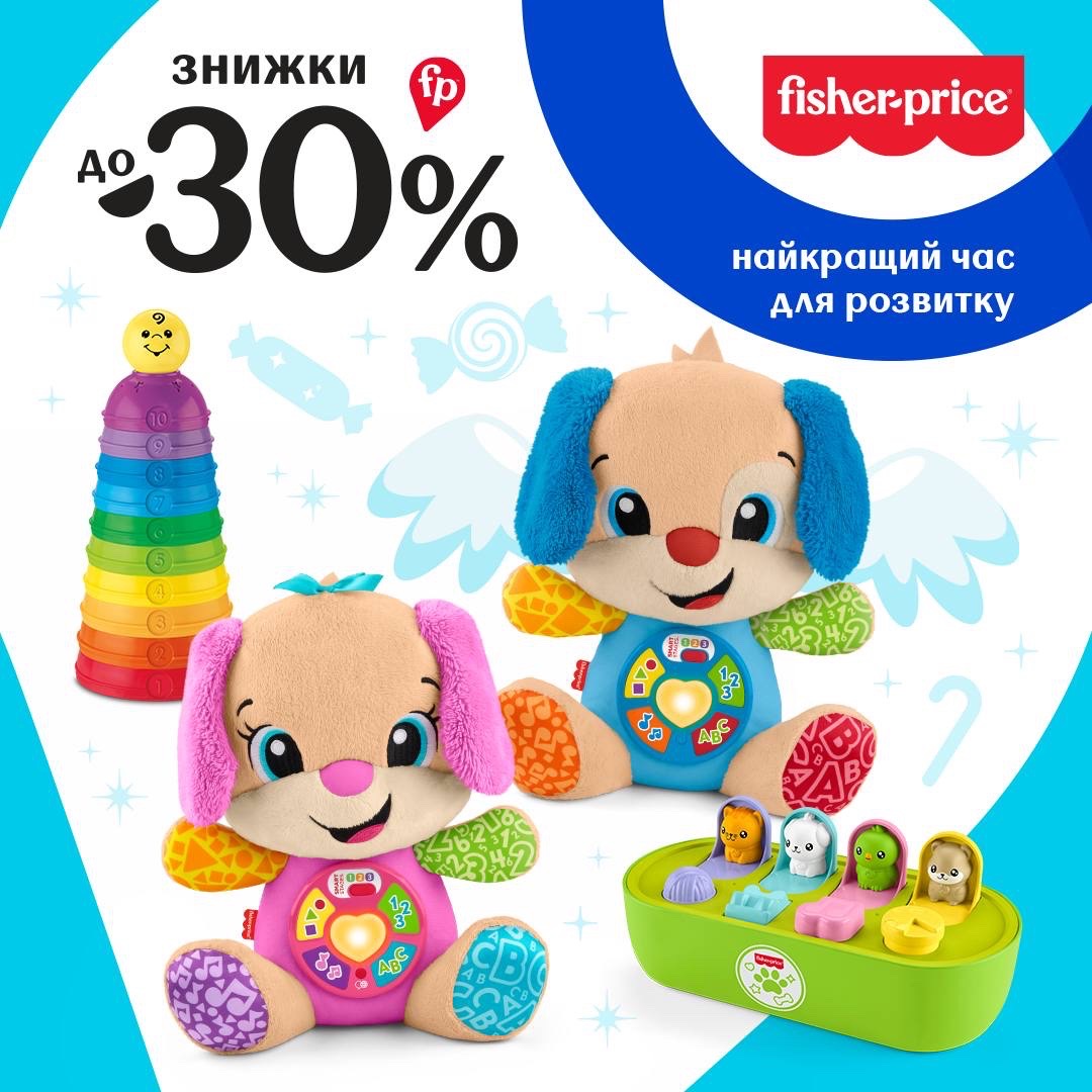 ДОКЛАДНІШЕЗнижки до -30% на розвиваючі іграшки Fisher Price 🧸 Яскраві пірамідки, інтерактивні собачки та музичні іграшки подарують малюкові море емоцій. Вони світяться, відтворюють звуки і надихають дитину на перші відкриття 👧👶 Акція діє до 08.12.2025 р. Знижка не сумується з карткою лояльності та іншими пропозиціями.