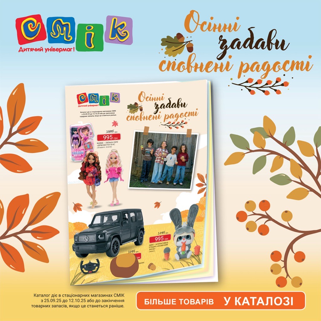 Осінній каталог знижок у СМІК вже стартував 🤩 Там так багато іграшок ⚡️ Ляльки, машинки, герої відомих мультиків, конструктори, роботи на радіокеруванні, настільні ігри, набори для творчості, мʼякі іграшки і динозаври! 🧦 А ще одяг: стильний, теплий, яскравий, з принтами і з дуже вигідними цінами! Гортайте каталог, вам сподобається! Каталог діє до 12.10.25 або до