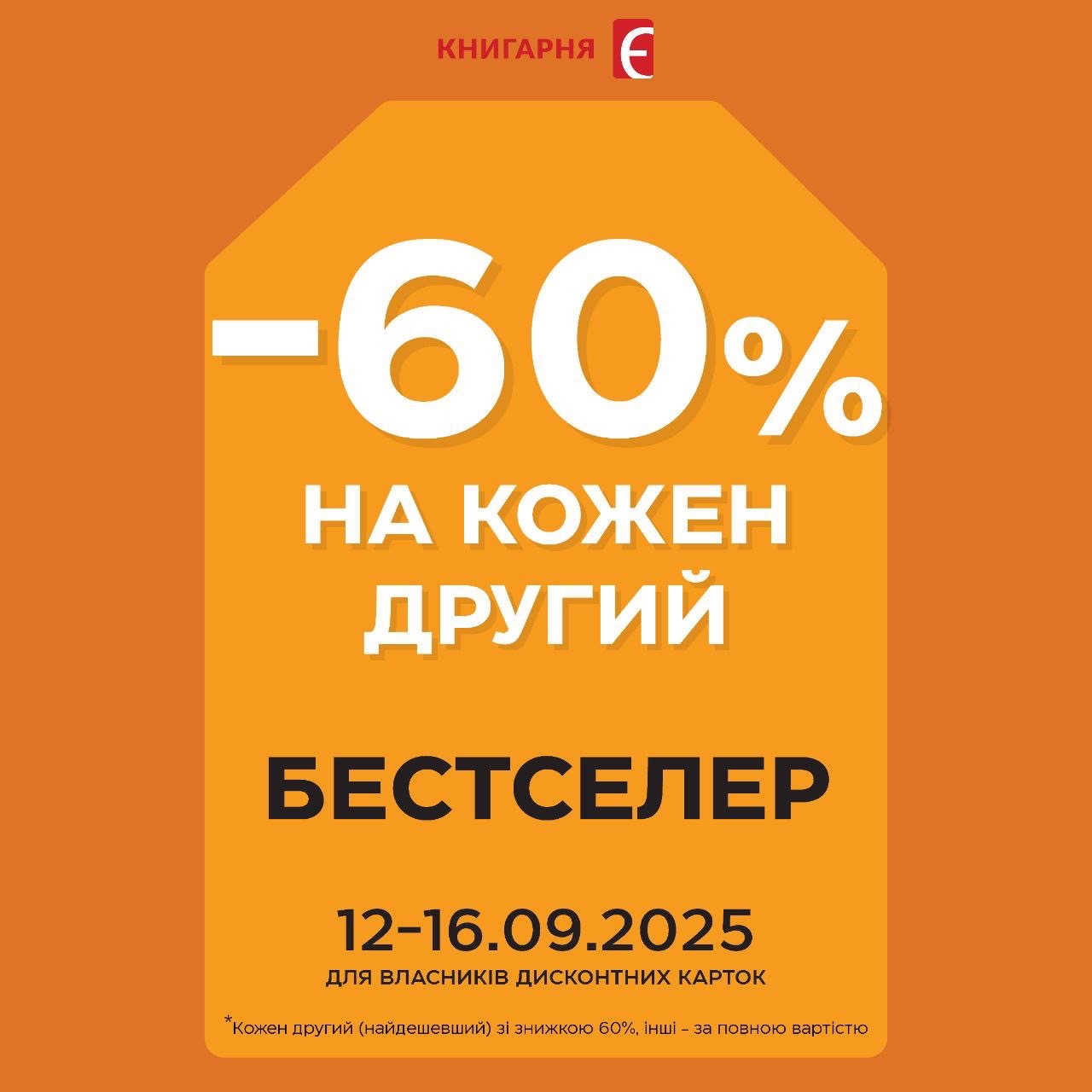 Супер-пропозиція у «Книгарня «Є»! -60% на кожен другий Бестселер! З 12 по 16 вересня діє особлива пропозиція: кожна друга книжка з добірки Бестселерів — зі знижкою аж -60%. 📚 У добірці на вас чекають найочікуваніші новинки, світові хіти та улюблені автори, які вже підкорили серця читачів. Список Бестселерів постійно оновлюється та доповнюється! 🟡 А щоб