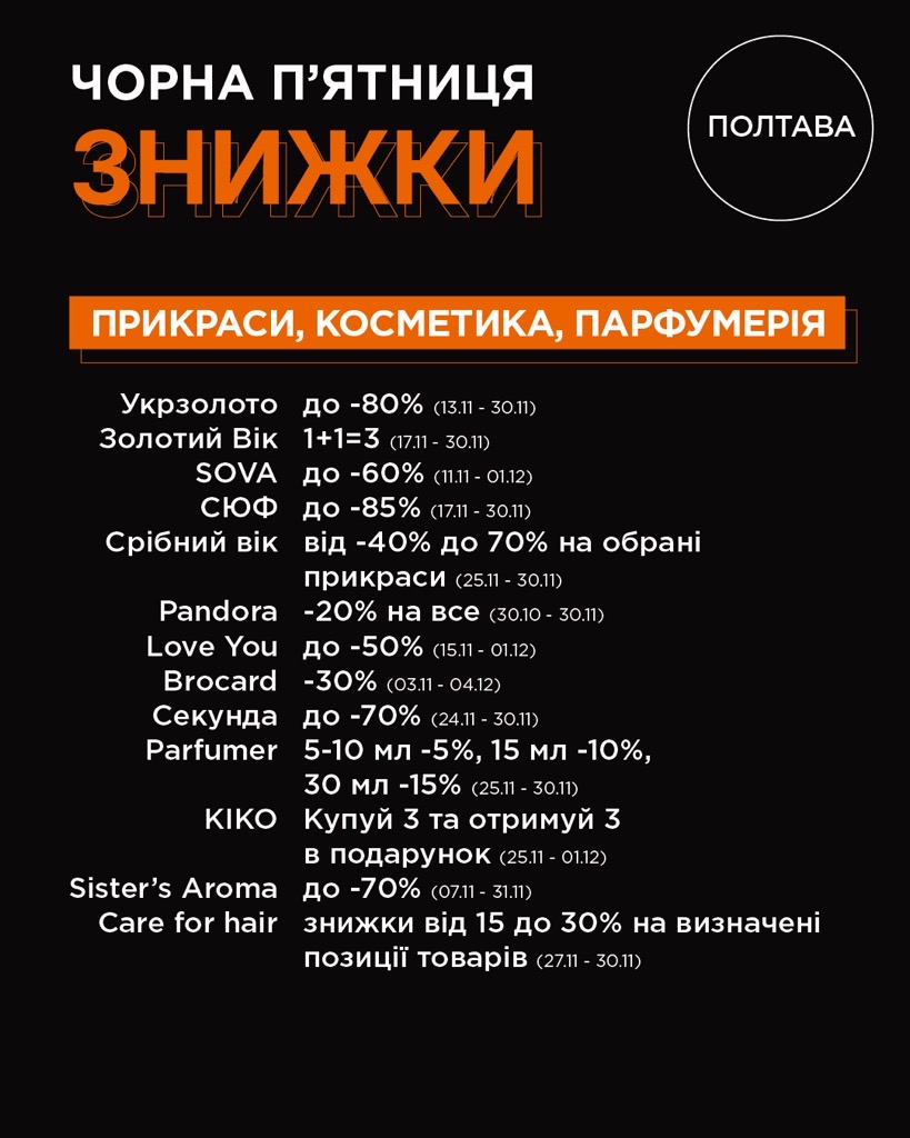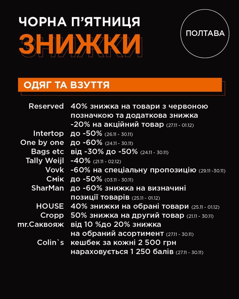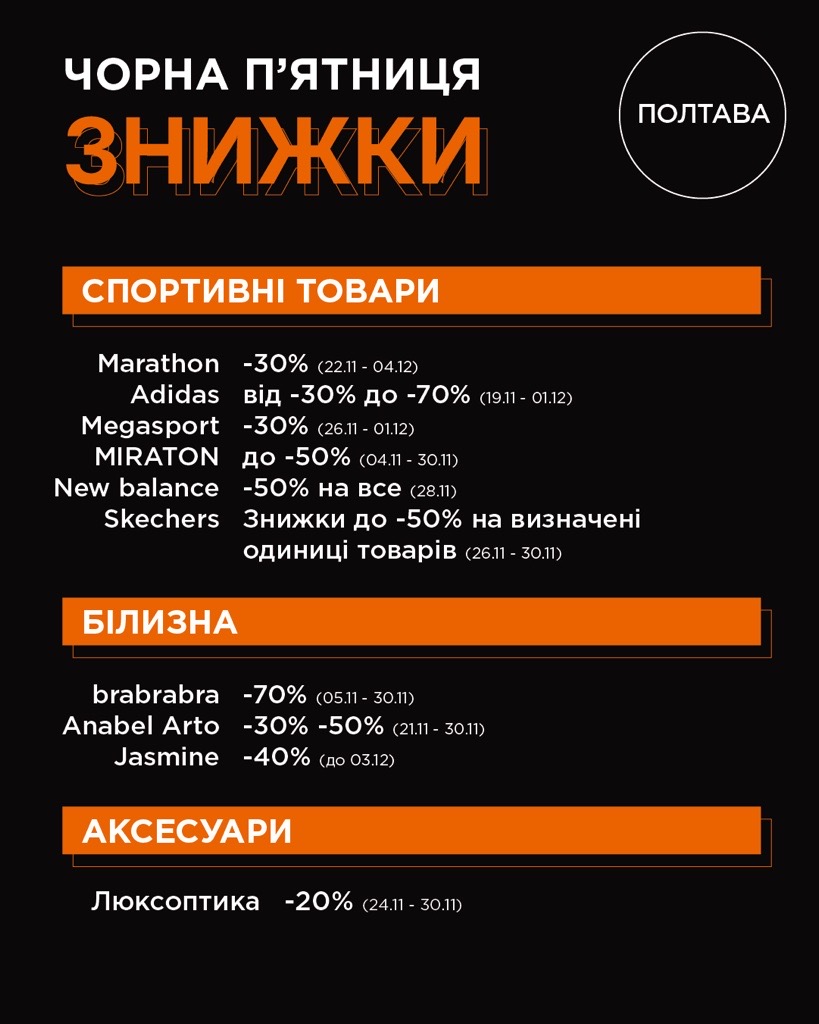Ми зібрали для вас повний список знижок та акцій від магазинів, щоб шопінг був максимально зручним та вигідним.Обирайте найвигідніше й приходьте за покупками, поки все найкраще не розібрали 😉
