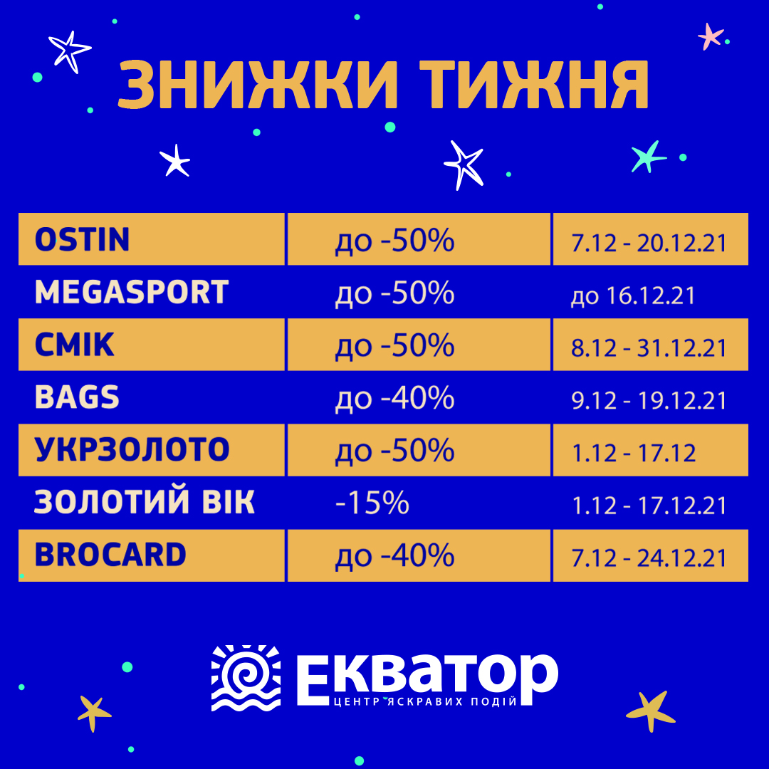 (Знижки діють в магазинах ТРЦ «Екватор» м. Полтава за адресою вул. Ковпака, 26)