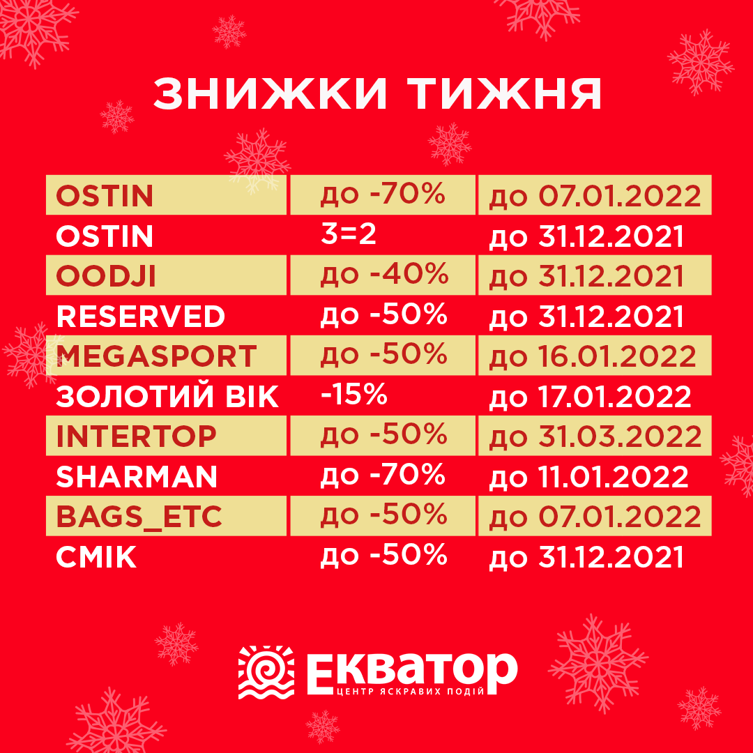 ЗНИЖКИ ТИЖНЯ В МАГАЗИНАХ ТРЦ «ЕКВАТОР» (ВІД 24.12.21)