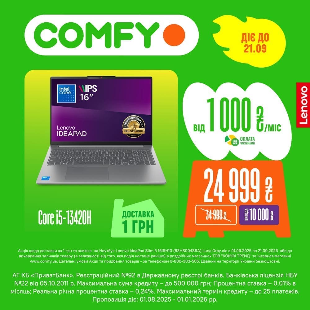 Най-най КРАЩ у COMFY 💚 Тільки з 01.09.2025 по 21.09.2025 р. Дивись, яка ціна👇 · Ноутбук Lenovo IdeaPad Slim 5 на Core i5-13420H 24 999₴ |було 34 999₴ від 1000 грн/ 25 міс · Роутер Mercusys WIFI 6 | 1 ГБІТ LAN/WAN 949₴ |було 1 399₴ ВИГОДА 32% · Пральна машина Bosch Інвертор/ 7 кг/ 1200