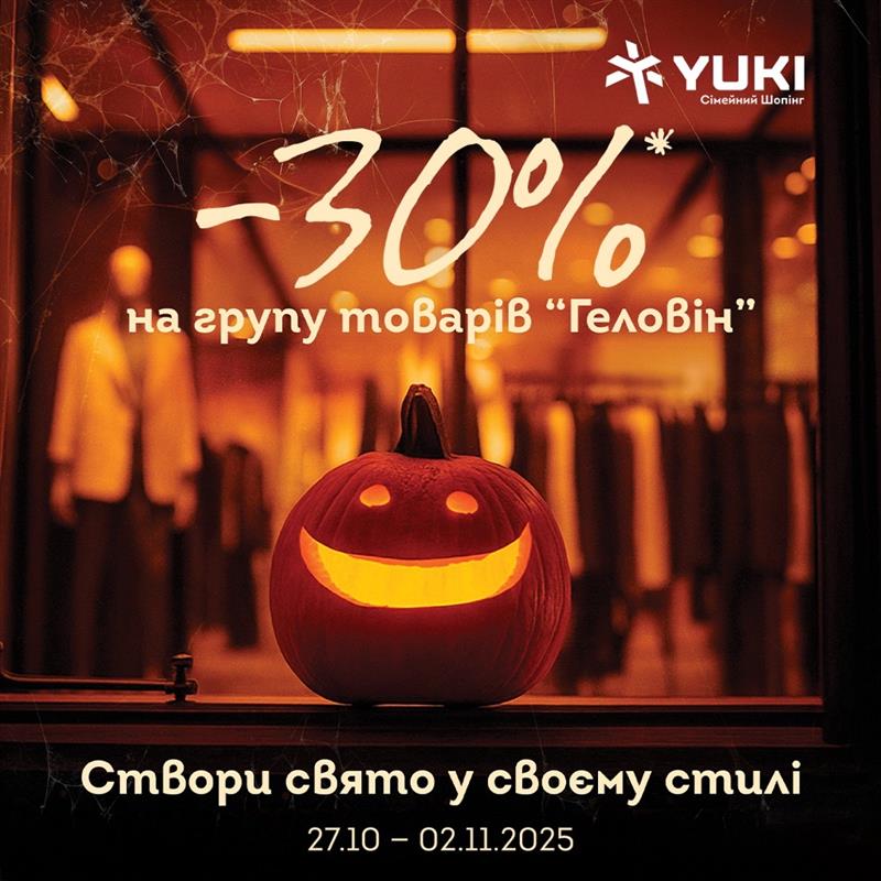 🎃 Геловін майже підкрався, а твій костюм ще не у шафі? Не страшно, YUKI вже все передбачив 👨💻 З 27.10 по 02.11.25 року знижки 30% на все 🕷 для святкового настрою: декор, костюми, світильники, магічні дрібнички. Поспішай, бо після 2 листопада навіть відьмочки рахують вигоду 🥰