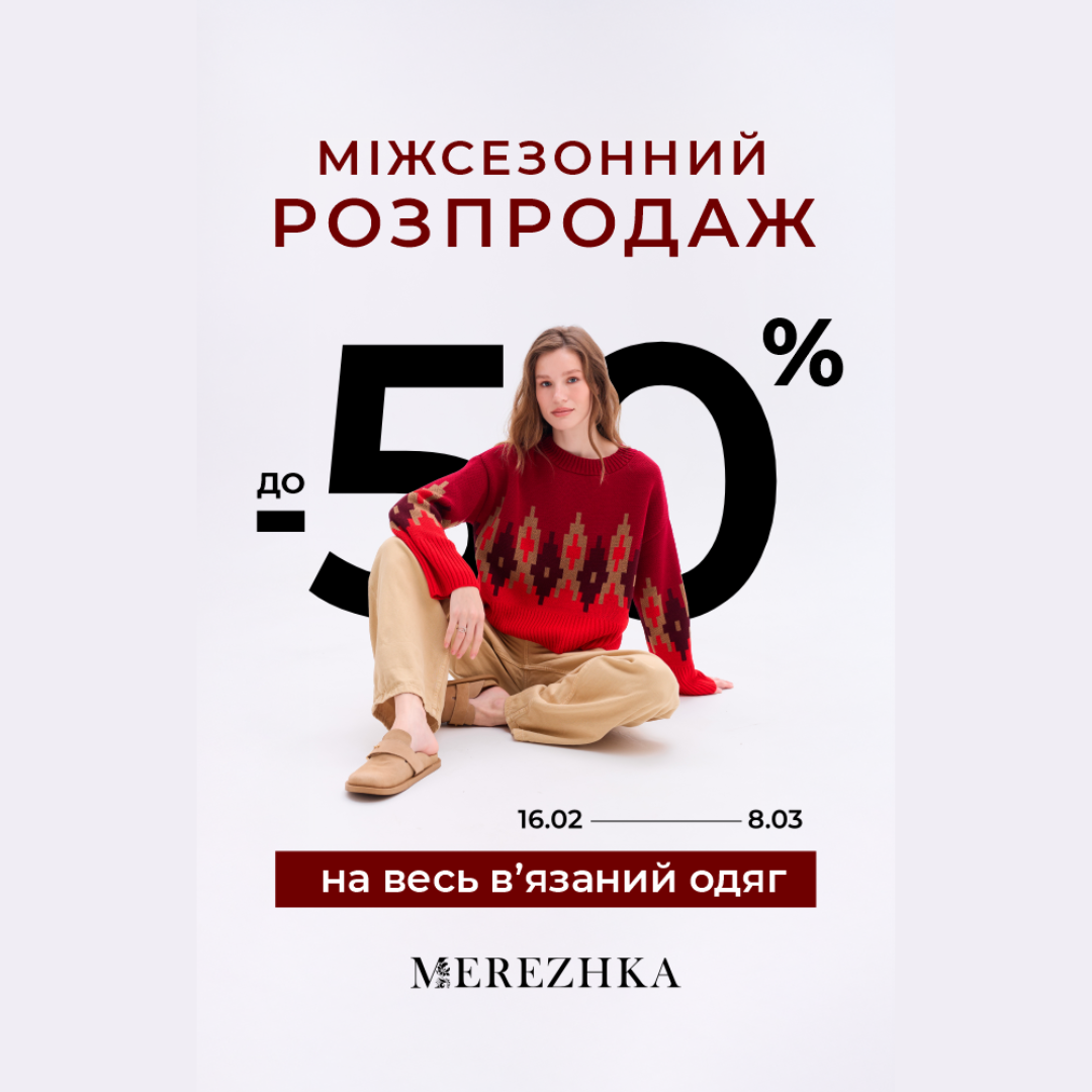 –50% на вʼязаний одяг! Міжсезонний розпродаж у MEREZHKA Тепло, стильно і дуже вигідно! 📆 16.02 – 08.03 Кількість обмежена – встигніть забрати своє.