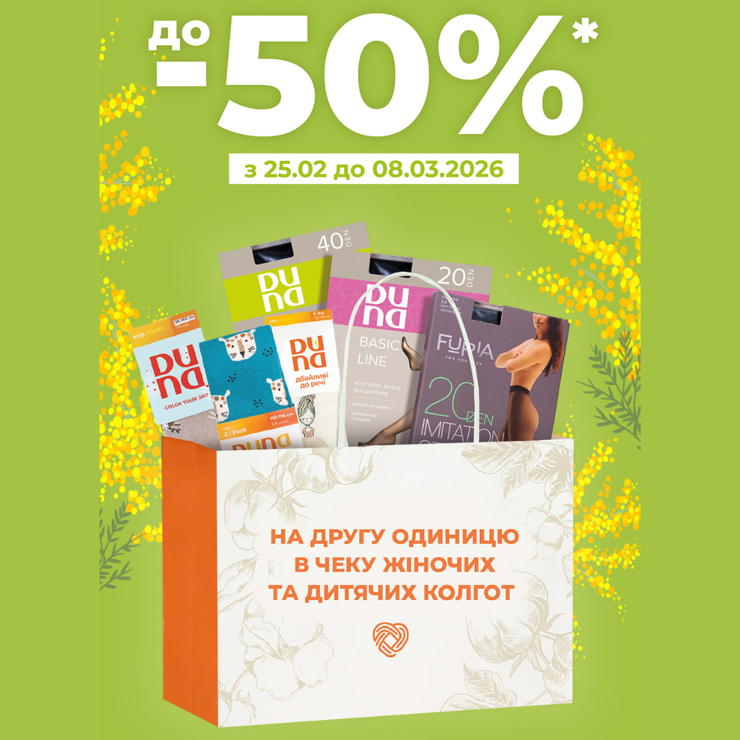 ДОКЛАДНІШЕЯскрава весна 🌸 з DUNA! Зустрічайте перше тепло стильно! Спеціально для учасників клубу лояльності DUNA FUN CLUB ми підготували весняну пропозицію. Придбайте 2 будь-які пари жіночих колготок або обрані моделі дитячих колготок та отримайте знижку 50% на другу дешевшу одиницю. Пропозиція діє з 25.02 до 08.03.2026 р у мережі магазинів DUNA по всій Україні та