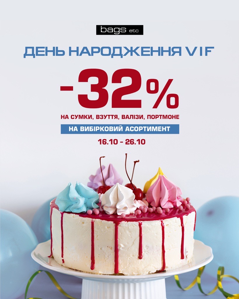 🎉Святкуємо 32 роки VIF разом! Спеціальна святкова пропозиція у магазинах BAGSetc та онлайн: ⠀ 🎂 -25% на весь асортимент ⠀ 🎂 -32% на вибіркові позиції ⠀ 🎂 Гарантований подарунок до покупок від 2500 грн ⠀ 📅 16.10.2025 — 26.10.2025 ⠀ Дякуємо, що Ви з нами! Давайте разом створювати нові історії з аксесуарами VIF!❤