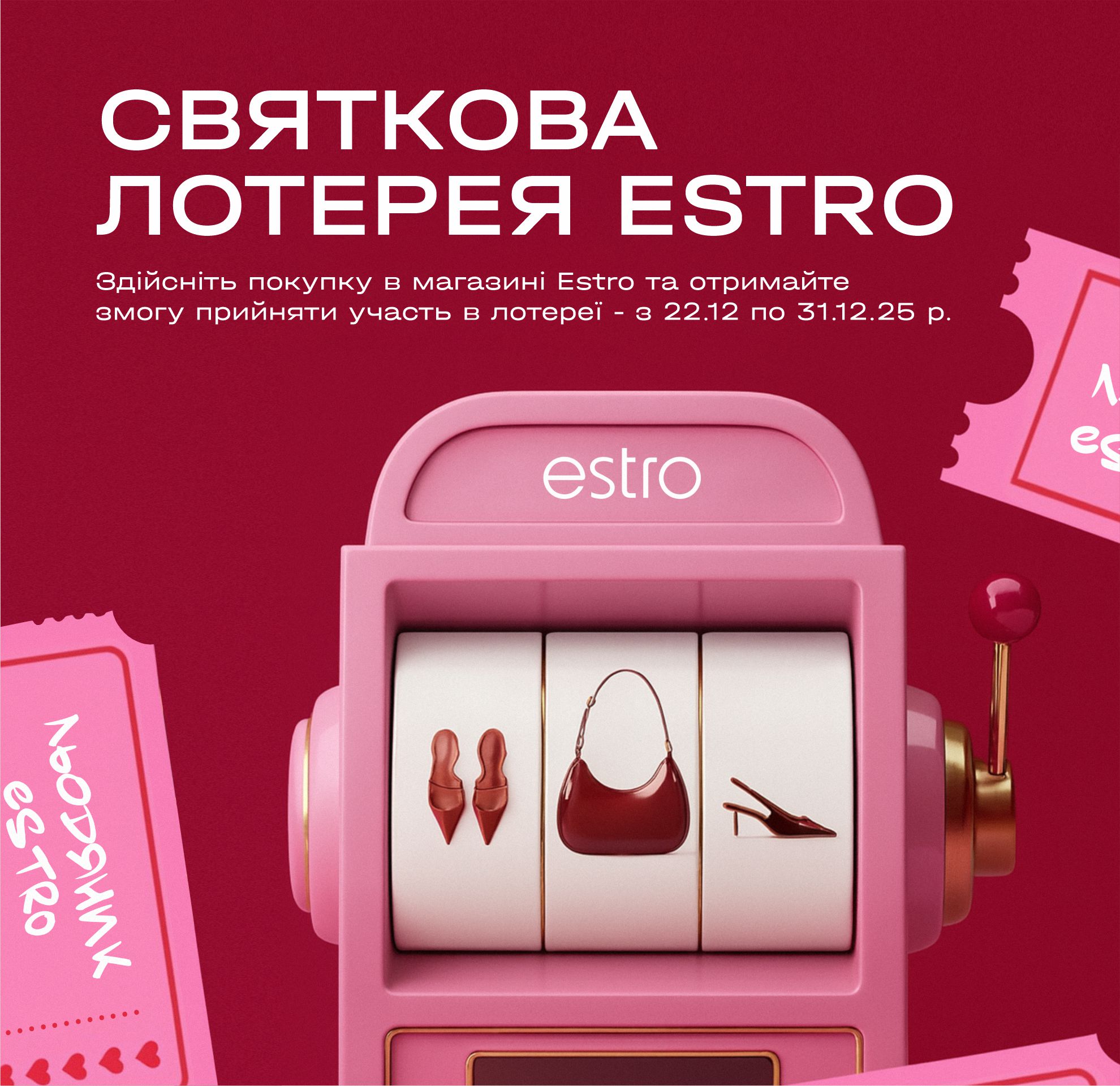 ДОКЛАДНІШЕСвятковий настрій починається з маленьких радощів в магазині Естро ✨ Зробіть покупку на будь-яку суму та візьміть участь у святковій лотереї. На вас чекає приємний сюрприз або тепле новорічне побажання — випробуйте свою вдачу! Пропозиція діє з 22 по 31 грудня 2025 року