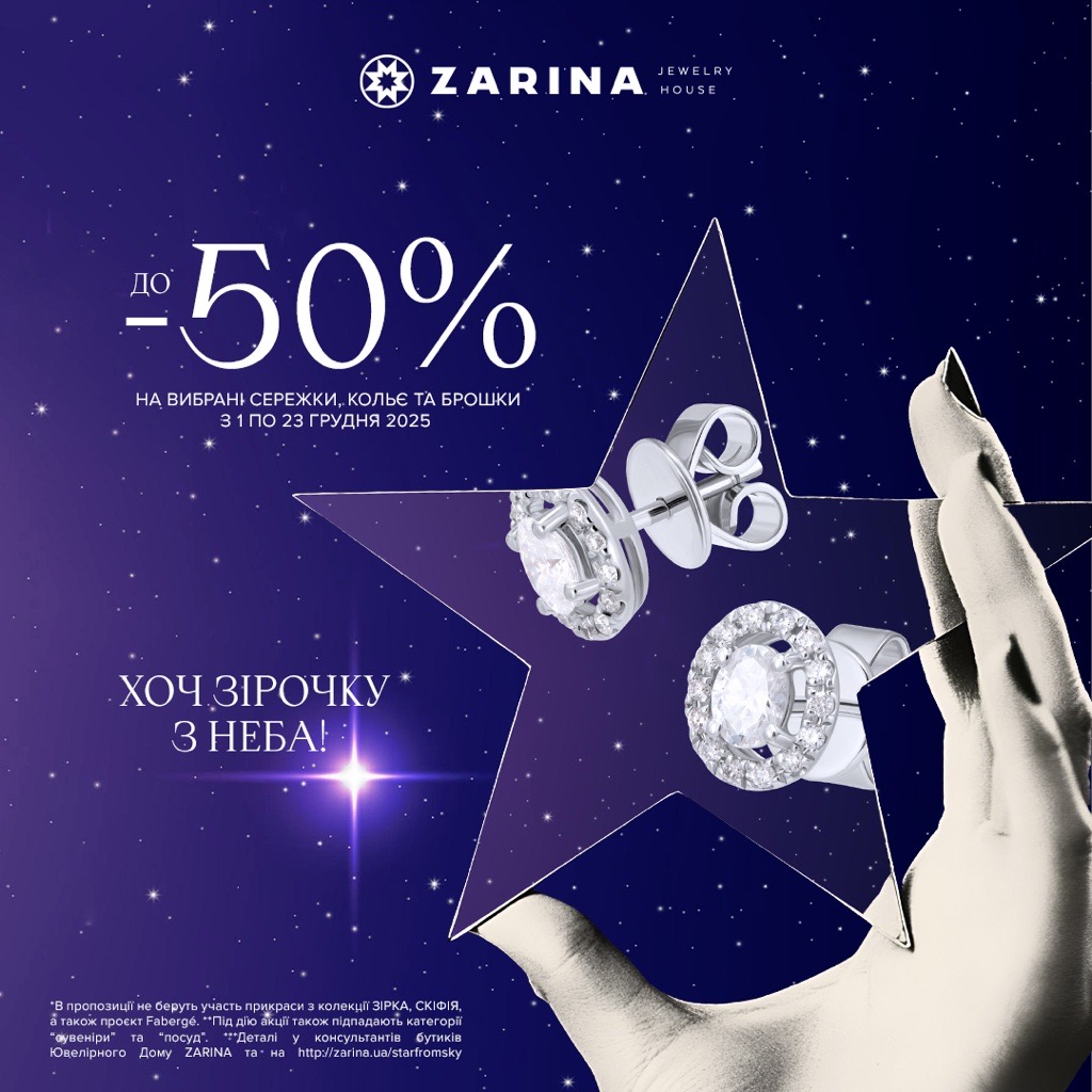 Хоч зірочку з неба! До -50% на вибрані прикраси: сережки, кольє та брошки. З Ювелірним Домом ZARINA дива стають ближчими. З 1.12.25 по 23.12.25! Даруємо до 50% на вибраний асортимент: срібні і золоті сережки, кольє, брошки з дорогоцінним та напівдорогоцінним камінням, а також з перлами. Відкривай сезон здійснення мрій — завітай до офлайн-бутика Ювелірного Дому
