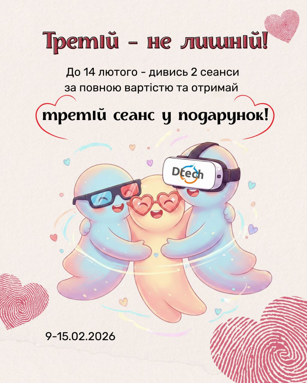 Dtech відкриває нам світ неземний, де кожна любов — це ковчег чарівний💕 А відкриваємо ми цей чудовий світ дивовижною акцію до Свята Кохання на VR-атракціоні Xride!🙌 З 9 по 15 лютого включно дивіться два сеанси за повною вартістю та отримуйте третій сеанс у подарунок!🔥 Погодьтеся, це буде фантастичне побачення, або крута дружня зустріч, або ж