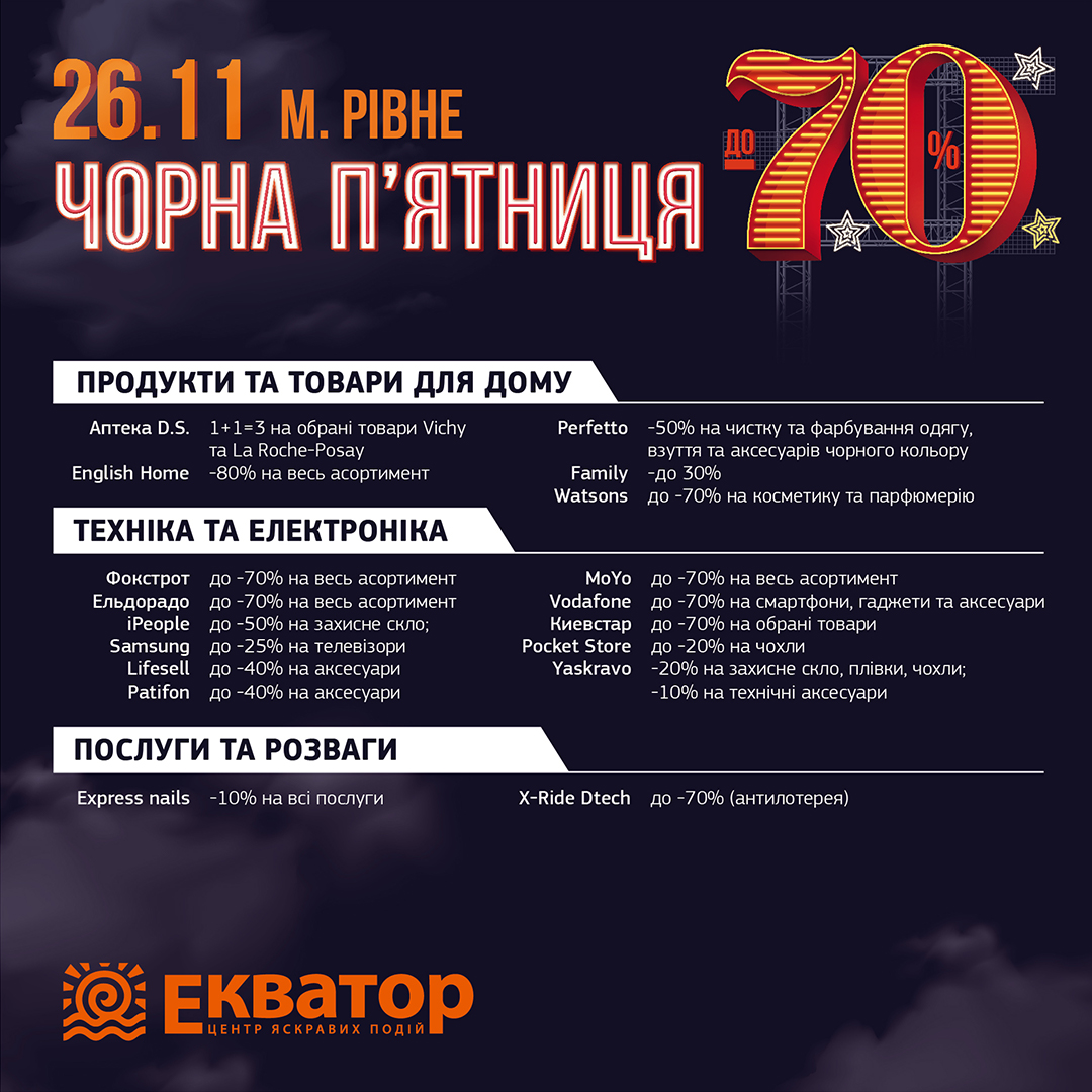 Найулюбленіші бренди, тотальні розпродажі, знижки аж до -70%, вигідні пропозиції на нові колекції, святкова атмосфера та подарунки від орендарів — все це чекатиме на тебе в ТРЦ «Екватор» у «Чорну п’ятницю».
