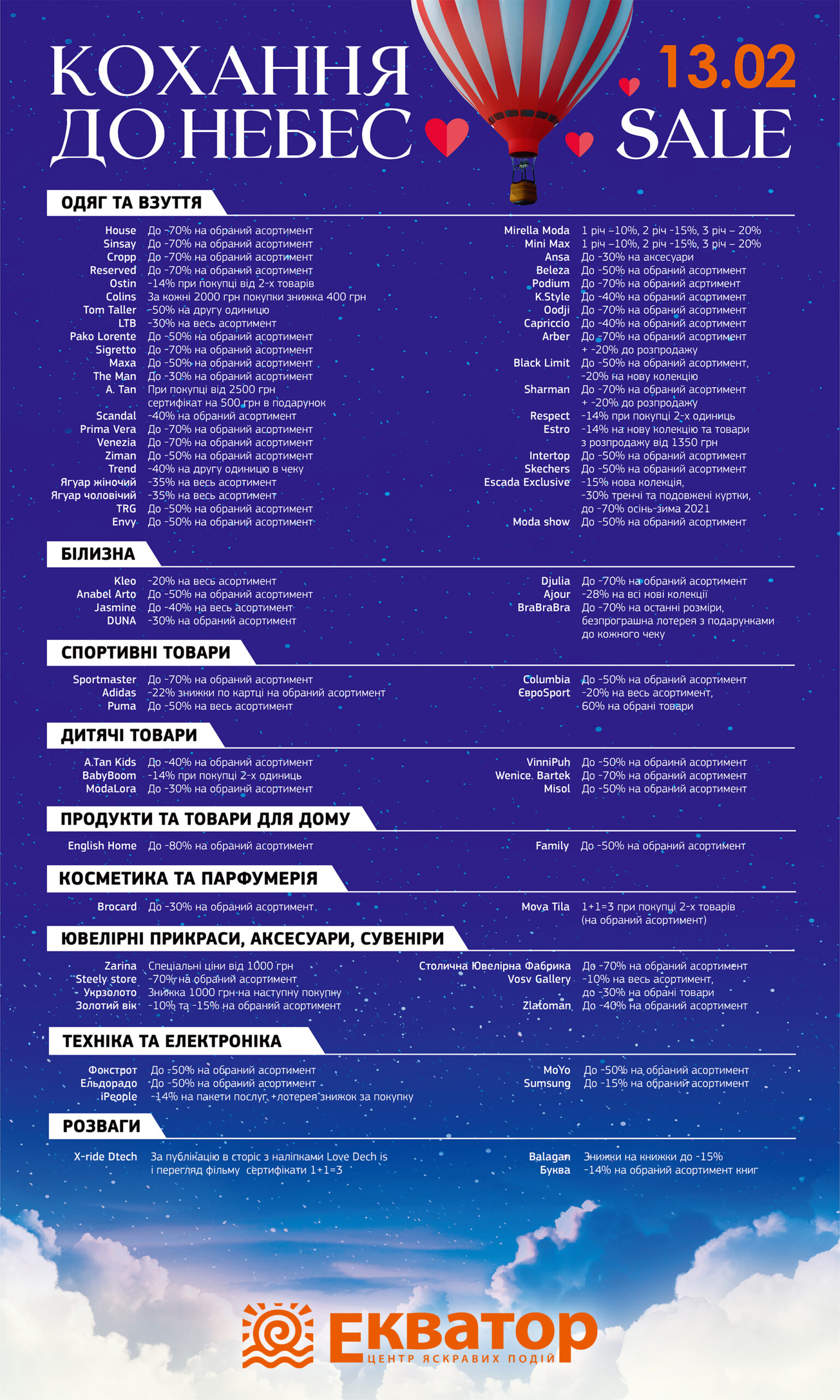 В ТРЦ «Екватор» на тебе чекає не лише розважальна програма, романтичний настрій і підйом на повітряній кулі, а й безліч знижок та спеціальних пропозицій від улюблених брендів😍 Завітай на шопінг та встигни обрати найкращий подарунок для своєї другої половнки😉