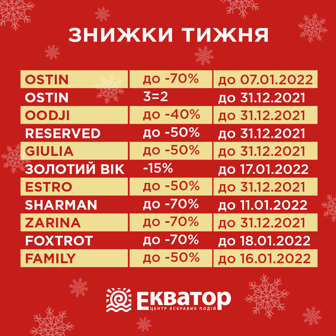 (Знижки діють в магазинах ТРЦ «Екватор» м. Рівне за адресою вул. Макарова, 23)